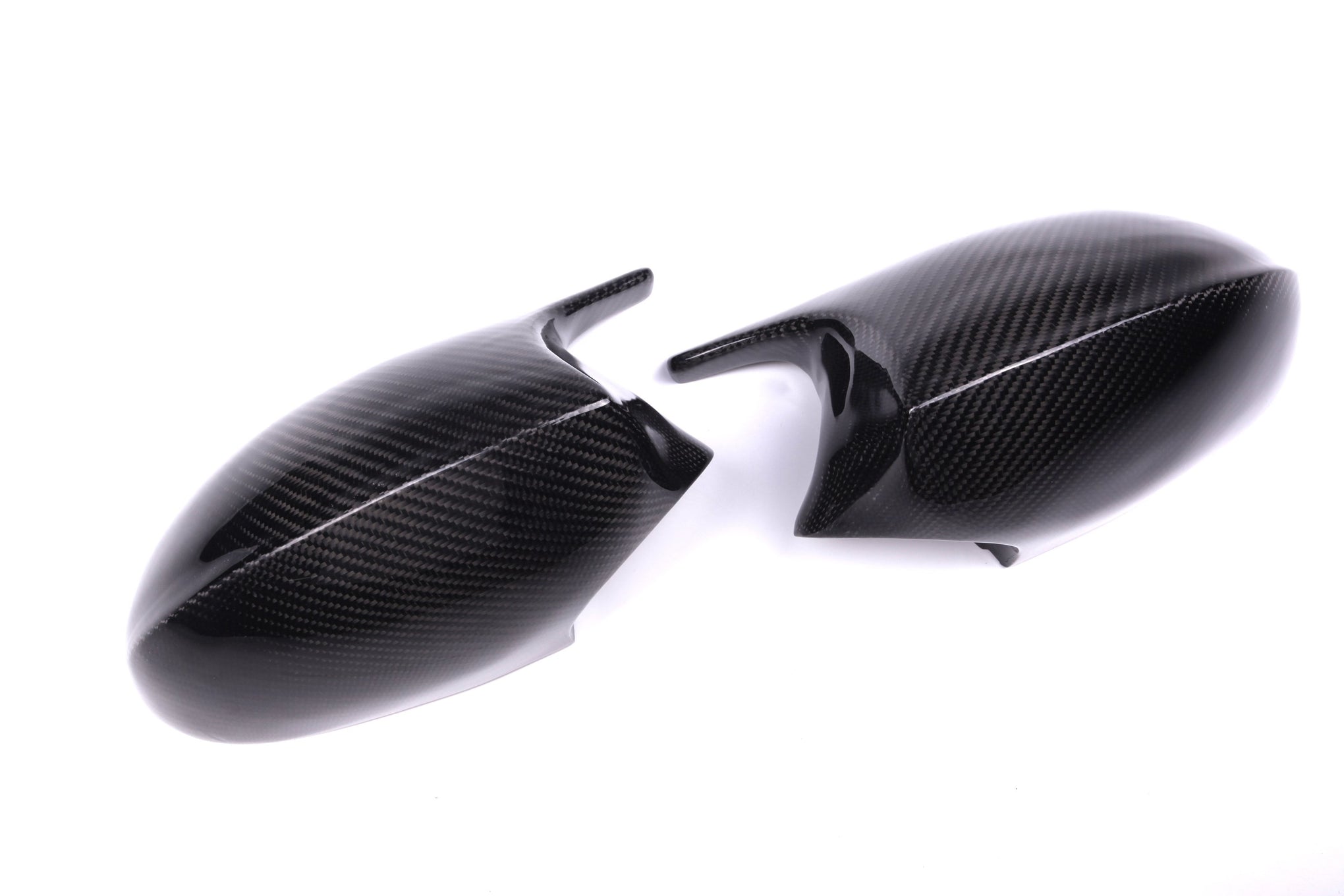 Two black carbon fiber car mirror covers face each other, resting on a plain white background, highlighting their glossy texture and sleek design.